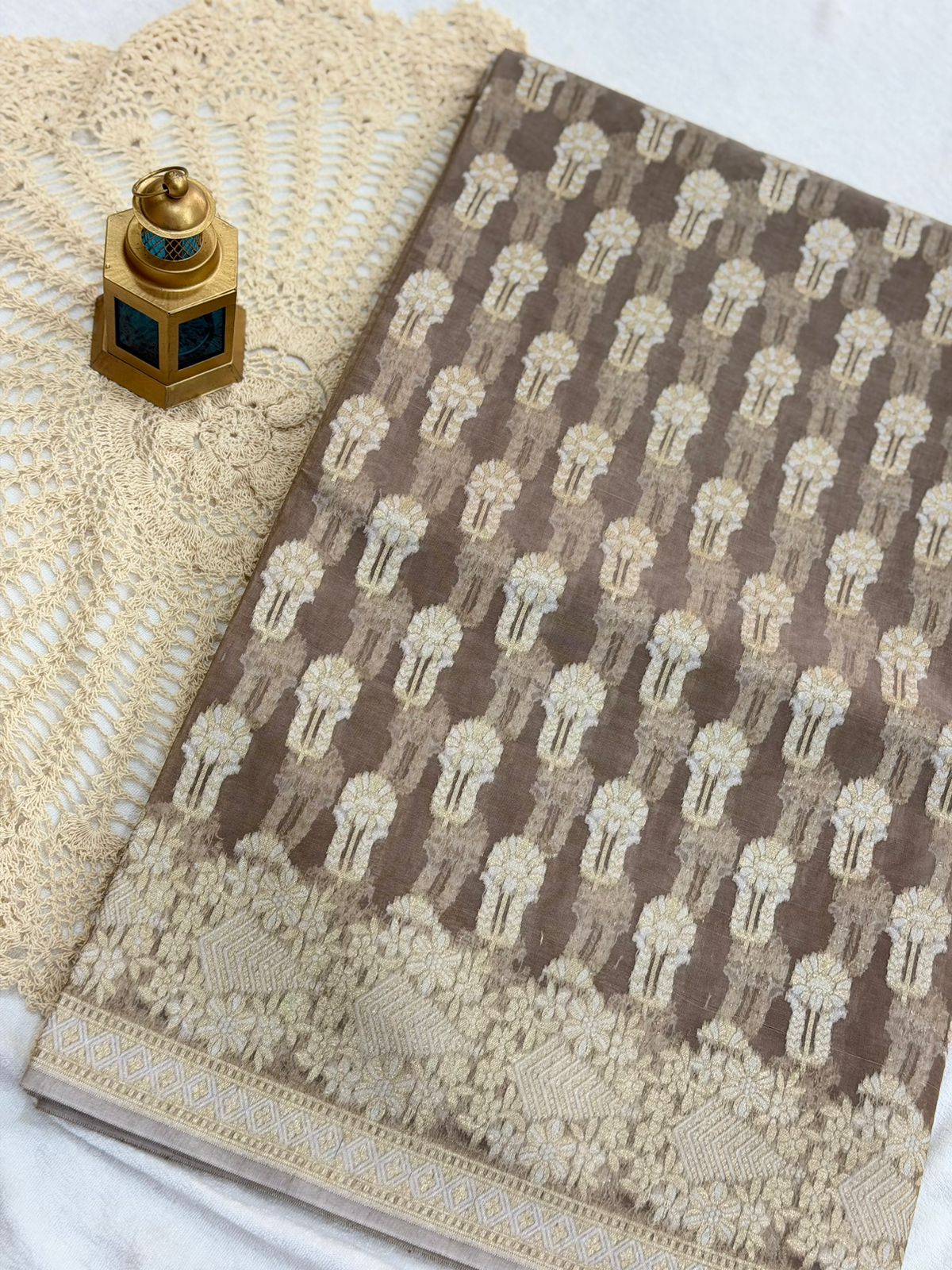 The subtle muddy taupe base paired with elegant off-white and gold threadwork creates a sophisticated and classy look — perfect for festive occasions, cultural events, intimate functions, or elegant daytime wear.