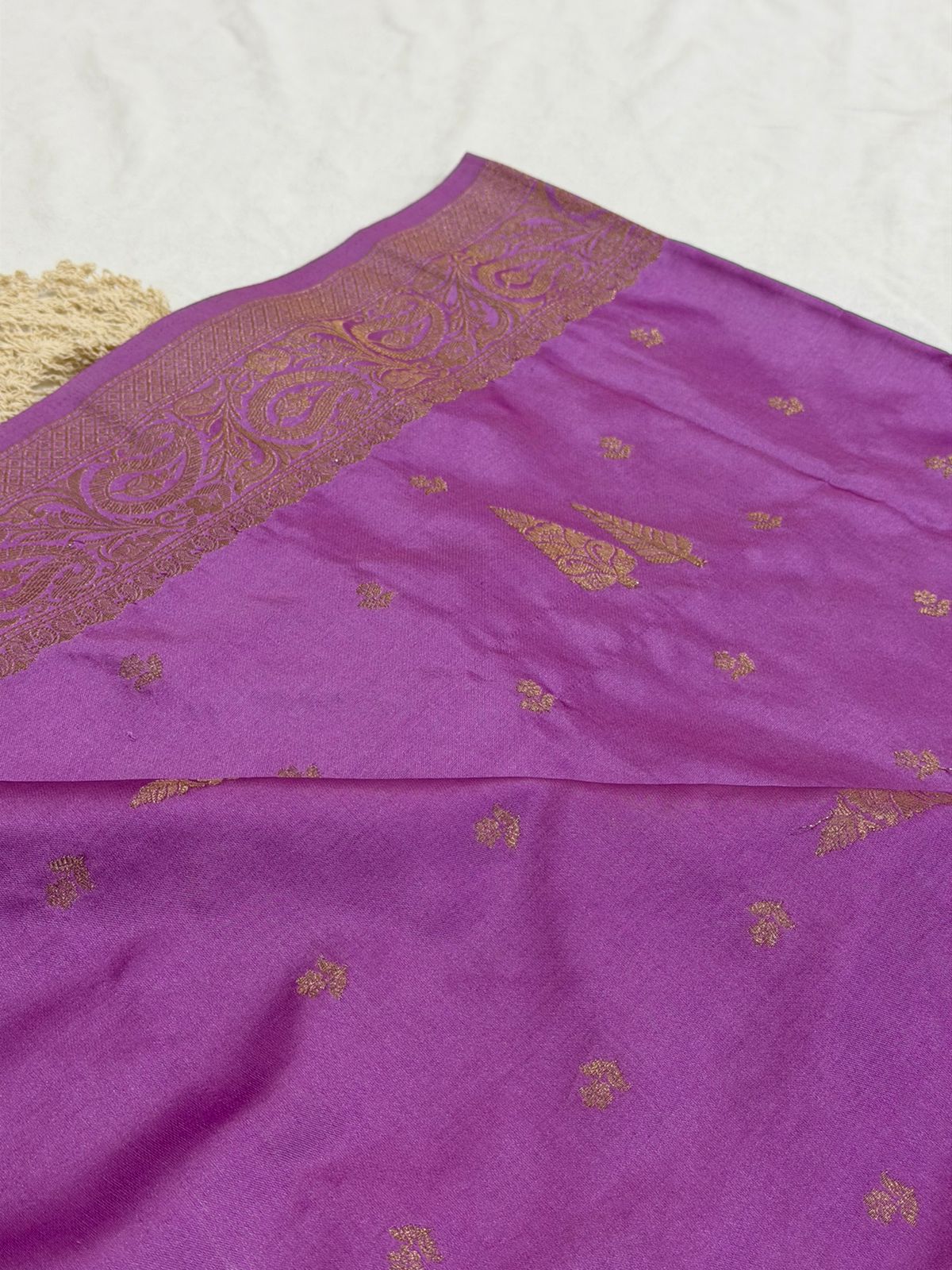 This saree features delicate golden zari buttas across the body, along with elegant tree motifs that add a touch of uniqueness. The highlight is the beautifully woven zari border and pallu, showcasing intricate floral and paisley designs that reflect traditional royalty.