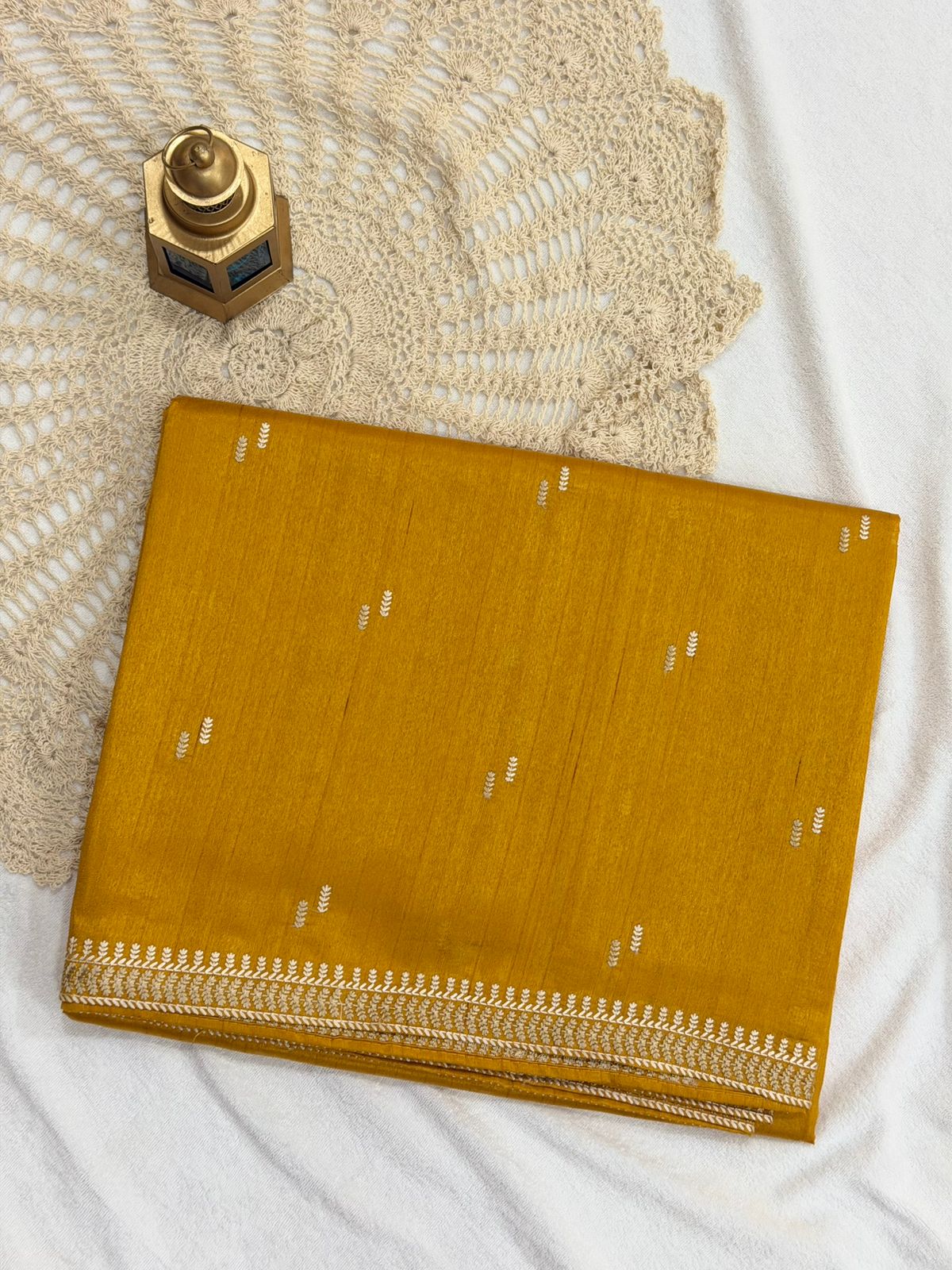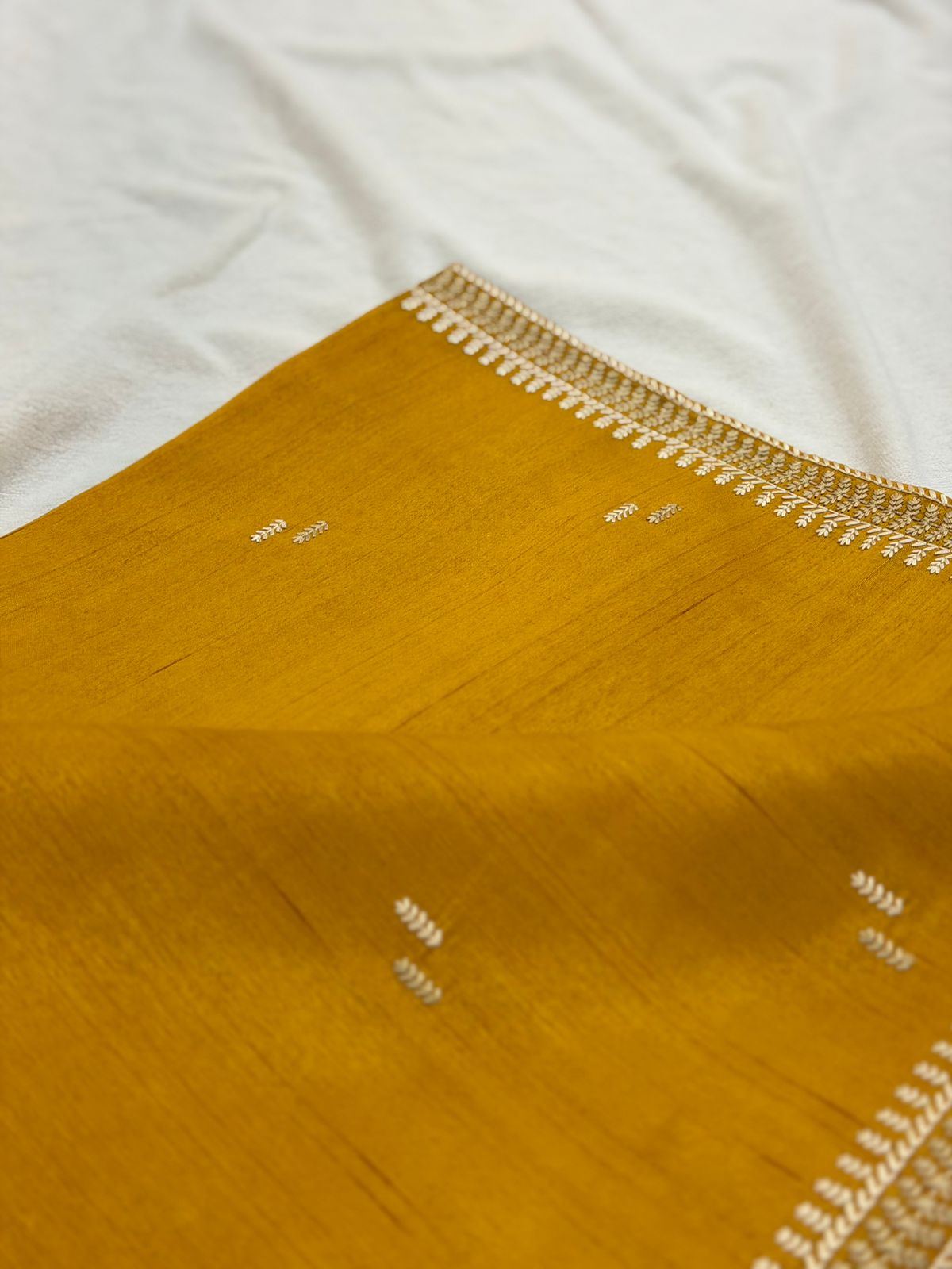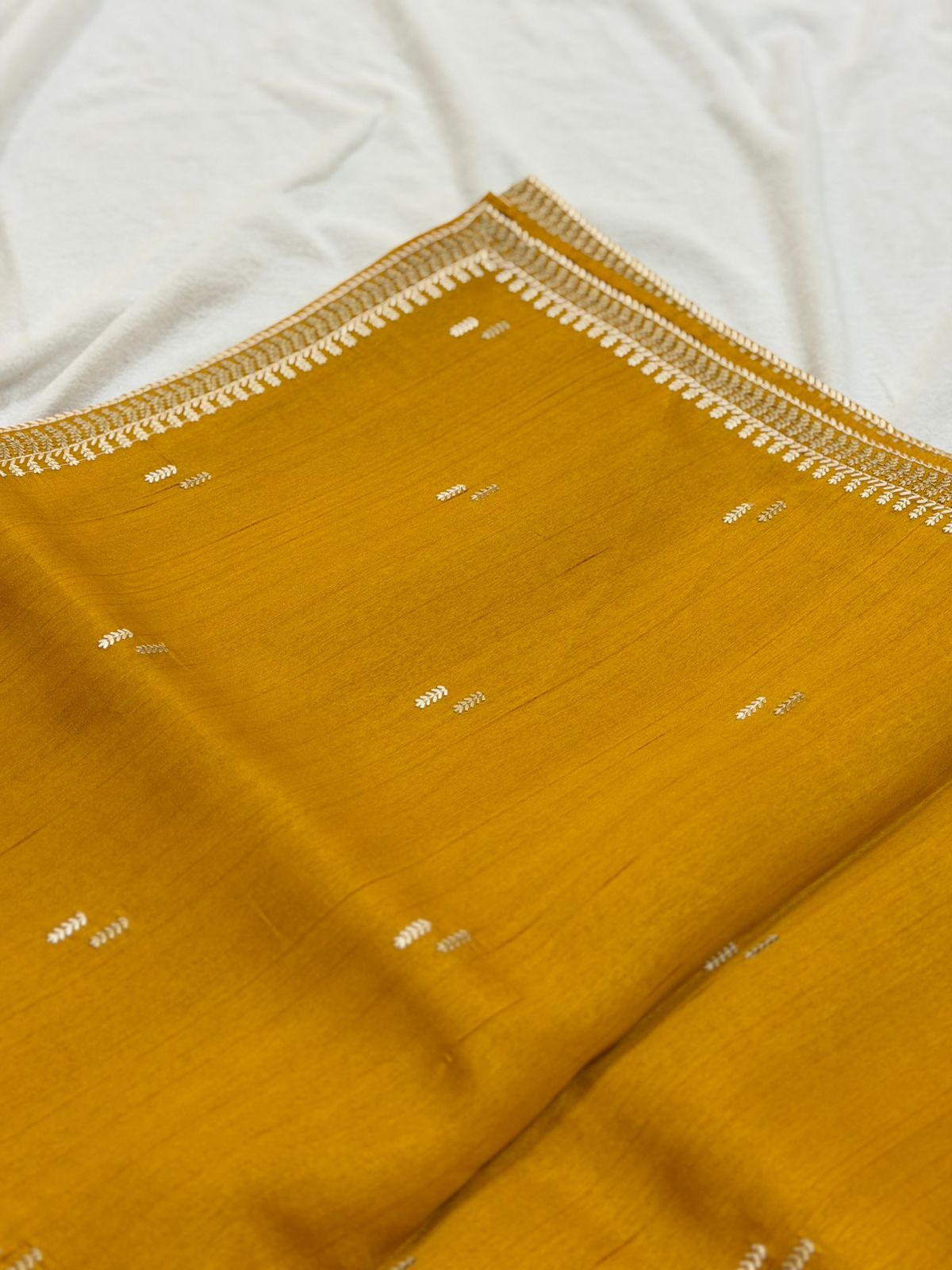 The rich mustard shade adds a warm and festive glow, while the body is adorned with delicate golden thread buttas, creating a minimal yet refined look. The saree is finished with a neat zari-embroidered border that adds just the right touch of traditional charm — without overpowering the design.